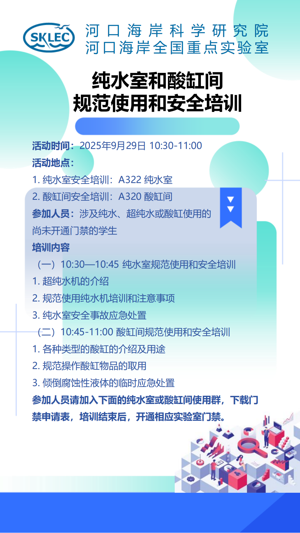 为了规范纯水机、制水室和酸缸室的使用,计划在2025年9月29日(下周一)上午10:30在A322制水室和A320酸缸室进行培训宣讲。请需要使用纯水机的新生和其他有需要用水但尚未开通权限的同学带好申请书(需包含取水用途、导师姓名、个人姓名、学号、联系方式等,申请书需有导师签字才予以认可)按时参加培训!同时,需要使用酸缸间的同学,也请将申请书带给苏函老师。